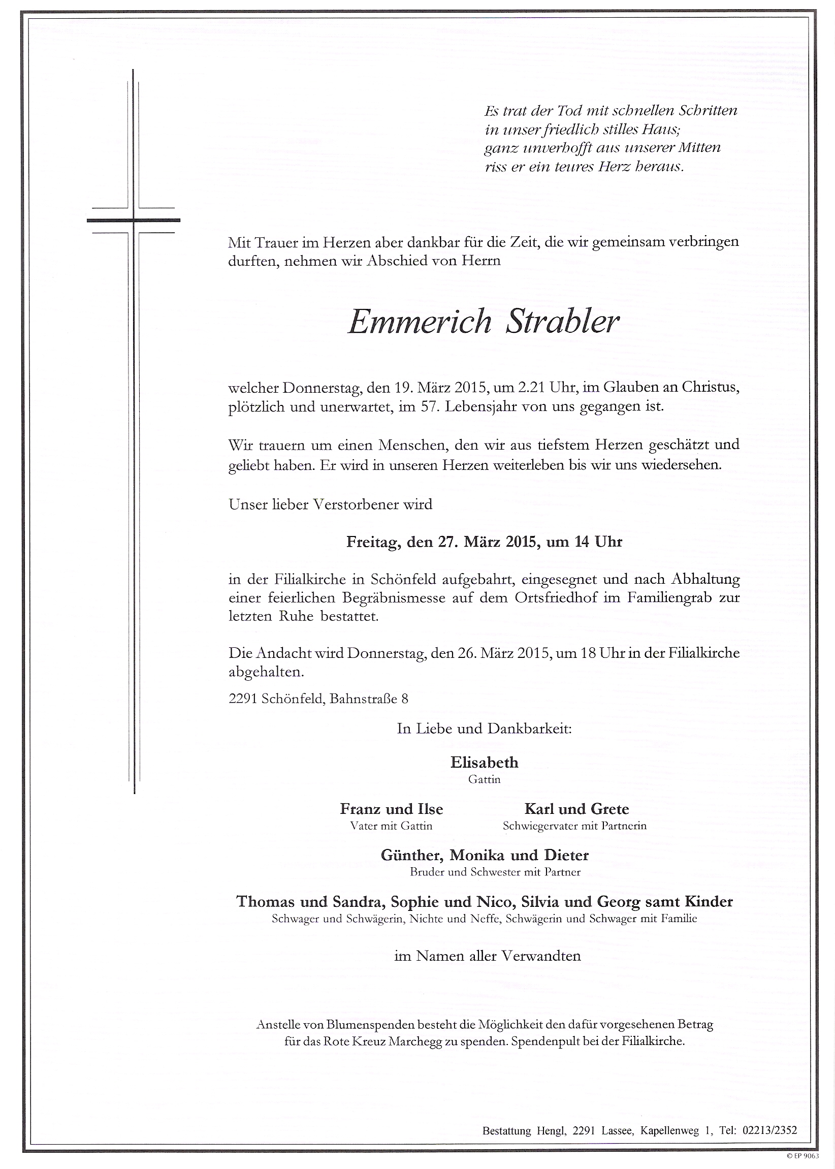 HFM Emmerich Strabler wurde am 27. März 2015 in seiner Heimatgemeinde auf dem Ortsfriedhof bestattet. Zahlreiche Feuerwehrkameraden, Angehörige, Freunde, Arbeitskollegen und die Bevölerung aus Lassee, Schönfeld und Umgebung erwiesen ihm das letzte Geleit.