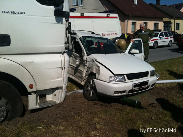 Am 13. Mai 2010 um 21:09 Uhr wurden die Feuerwehren Schönfeld und Untersiebenbrunn mittels Totalalarm (Sirene, Personenrufempfänger und SMS) zu einem Verkehrsunfall mit vermutlich eingeklemmter Person zwischen Schönfeld und Untersiebenbrunn alarmiert.